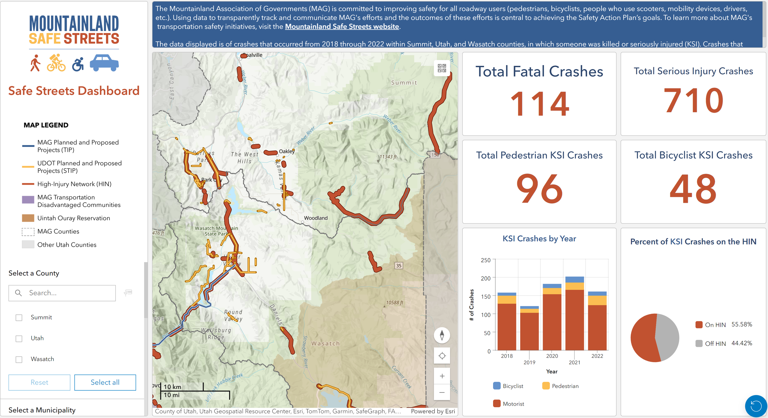 The Vision Zero Data Dashboard is an interactive tool that displays some of the key trends for crashes their locations within Utah, Wasatch, and Summit counties. Using data to transparently track and communicate the region’s efforts and the outcomes of these efforts is central to achieving the Safety Action Plan goal.