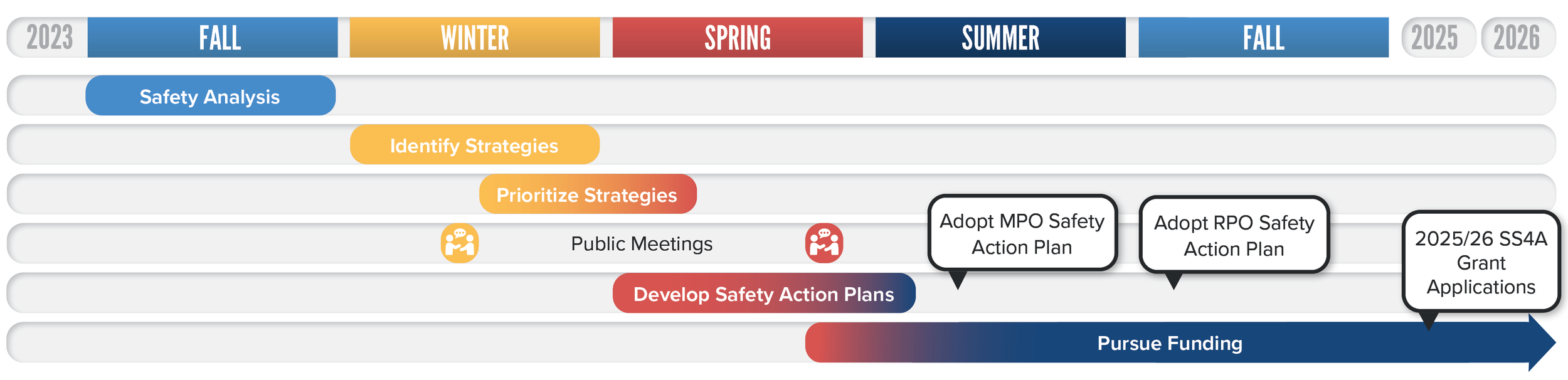 The first phase of the Safety Action Plan process is completed, and a list of initial projects was prepared. Cities and counties are beginning to identify funding for projects including possible SS4A grant funds in 2025 and 2026.
